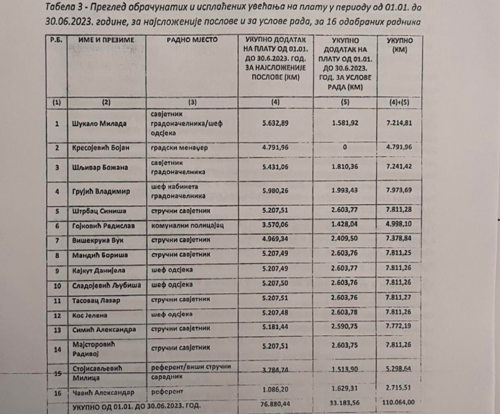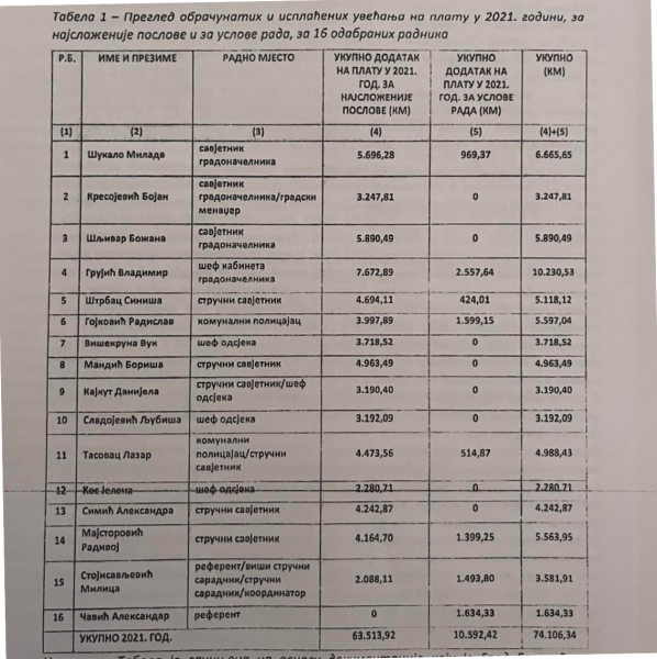 Dokument u koji je imao uvid CAPITAL pokazuje da je najveći iznos otišao za naknade za šefa kabineta gradonačelnika Vladimira Grujića u iznosu od 33.690 KM.