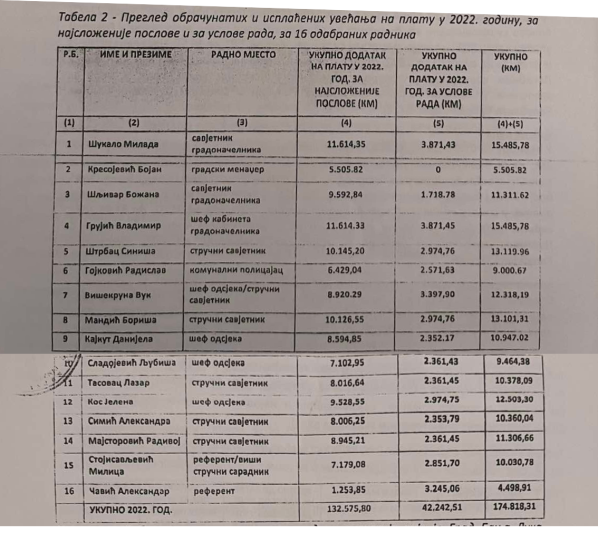 Na listi se nalazi i šef odsjeka/stručni saradnik Vuk Višekruna (23.415 KM), šef odsjeka Jelena Kos (22.594 KM), stručni savjetnici Lazar Tasovac (23.177 KM) i Aleksandra Simić (22.374 KM), šefovi odsjeka Danijela Kajkut (21.948 KM) te Ljubiša Sladojević (20.467 KM), komunalni policajac Radislav Gojković (19.595 KM), referent Milica Stojisavljević (18.910 KM), gradski menadžer Bojan Kresojević (13.545 KM) te referent Aleksandar Čavića (8.848 KM).