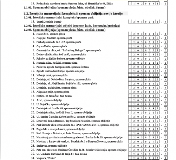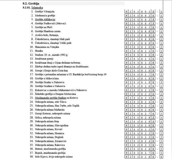 Faksimil dijela liste „zaštićenih i prethodno evidentiranih spomenika spomenika“ na kojoj su sva navedena mezarja