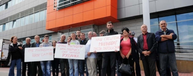 Na proteste ispred zgrade RTRS ova grupa je došla u kombi mercedesovom mini busu, a nosili su transparente na kojima je pisalo "Oče Milidraže nisi sam" i "Otac Milidrag ima podršku naroda Rudanke".