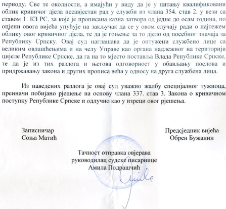 Naravno da je kafana bila u pravu. Sud u kafani ili kafana u sudu, kako god hoćete, rezultat je isti. Vrhovni sud RS, po drugi put je uvažio žalbu Specijalnog tužilaštva RS i pobio rješenje Okružnog suda Banja Luka, koji se dva puta proglasilo nenadležnim u montiranom procesu koji se protiv mene vodi. Šta vam to vrijedi sudije, kad je Baja rekao da će se sa mnom baviti njegovi Specijalci. Ima tako i da bude!
