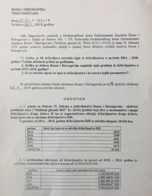 Ovo su podaci koje je poslanik u Predstavničkom domu Parlamentarne skupštine BiH Saša Magazinović dobio nakon što je postavio poslaničko pitanje Ministru civilnih poslova BiH.