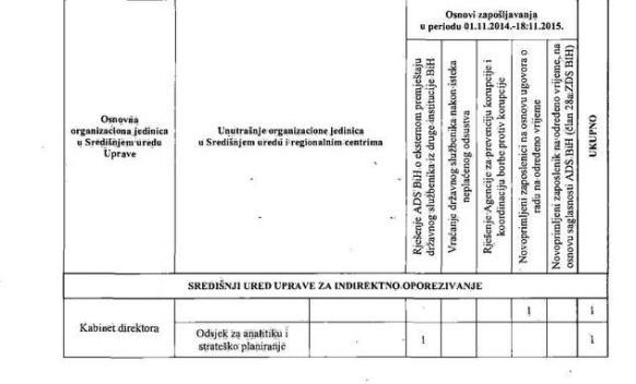 U Centralnom uredu Uprave za indirektno oporezivanje za dvanaest mjeseci bez raspisivanja konkursa zaposleno je devet osoba, i to sedam na osnovu ugovora o radu na određeno vrijeme i dvije osobe po rješenju Agencije za državnu službu BiH o eksternom premještaju državnog službenika iz druge institucije.