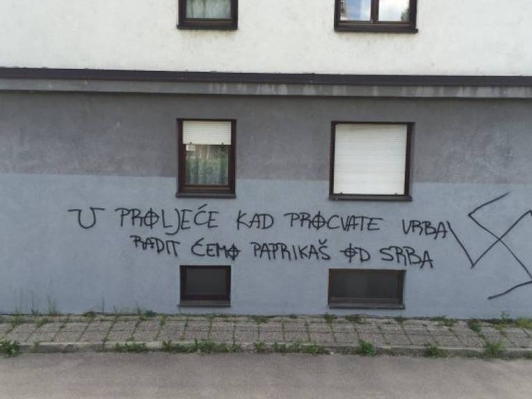 Osim što je gotovo svaka zgrada obeležena svastikom, natpisi usmereni protiv Srba posebno su gnusni, navodi N1. Autori ovih grafita potpisuju se kao "BBB Norci" i "Ustaše Remiza".