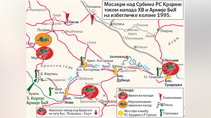 Ледени прст хрватског пилота који притиска дугме и ноншалантно испаљује ракете на згуснута возила, претрпана страдалничком сиротињом, на Петровачкој или Приједорској цести, дубоко у Босни… Или распамећени бојовници 5. корпуса Армије БиХ из бихаћке ратне енклаве, који су прегазили Уну и ушли на Банију, а онда бајонетима мрцварили до смрти српске цивиле и војнике у повлачењу, арлаучући „као Индијанци”, како је ситуацију детектовао сплитски „Ферал трибјун”, у репортажи И. Ђикића Peti corpus delicti (23. 9. 2000).
