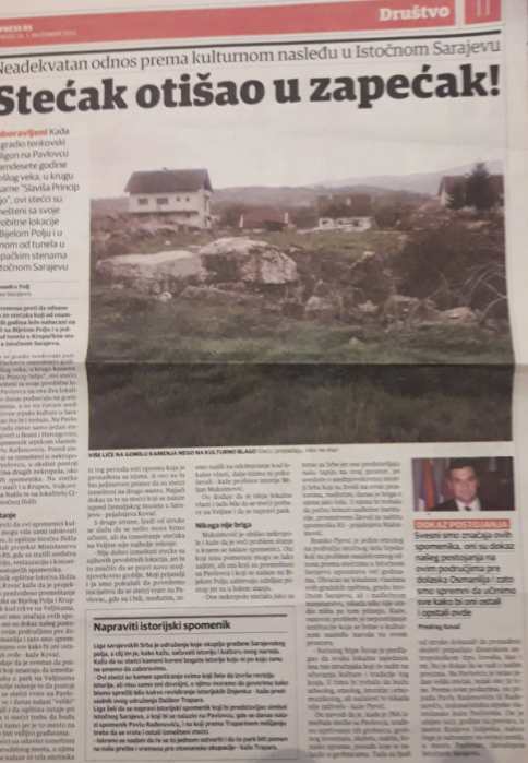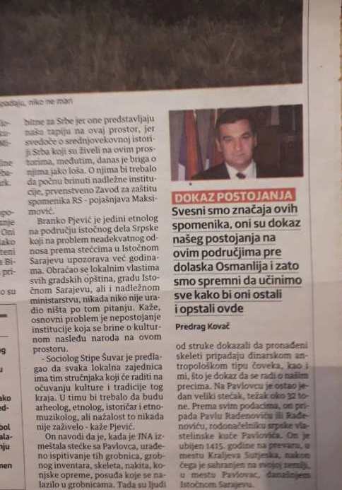 “Otac Vanja Jovanović iz Stare crkve na Baščaršiji je 2012. godine izdao brošuru o stećcima na Pavlovcu. Učestvovao sam u realizaciji tog projekta. Sljedeće godine sam sa par istoričara i etnologa pokrenuo priču o tematskom parku “Nekropola Pavlovac”. Imali smo sastanak sa Ćosićem gdje je on podržao ideju. Problem je bio što je samo dio stećaka bio u opštini Istočno Novo Sarajevo dok je drugi deponovan u tunuel kod Krupca, prema Kijevu, što je opština Istočna Ilidža. U tadašnjem Press.rs je izašao tekst 1. 12. 2013. godine kojim smo napravili pritisak na vlast. Nažalost, ostalo je samo na obećanjima”, priča naš sagovornik.