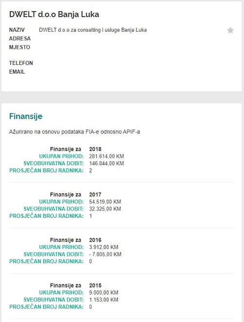 Inače, „Dwelt“ je osnovan 2015. godine, kada i „Prointer“. Te prve godine ova firma je imala samo 1.153 KM dobiti, a sljedeće 2016. su bili u minusu 7.805 KM. Tada nisu imali ni jednog zaposlenog radnika, da bi već 2017. godine, nakon što su zaposlili jednu osobu ostvarili dobit od 32.325 KM, a prošle godine im je dobit porasla na 146.844 KM, a broj zaposlenih na dvoje.
