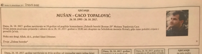 „Dana 26. 10. 2017. godine navršavaju se 24 godine od pogibije komandanta Mušana Topalovića Cace“, napisale su „njegove“ Beretke, koje su, potom, narodnim novcem koji im svake godine bude odobren iz budžeta svih sarajevskih gradskih opština, zamolile „dragog Allaha da Mušanu Topaloviću podari lijepi džennet“.