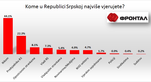 Od institucija koje smo opciono naveli najviše povjerenja u ovoj anketi dobio je predsjednik Republike Srpske. Više od 22 odsto je odgovorilo da njemu vjeruje. Na trećem mjestu su opozicione stranke sa 8,1 odsto. Slijede Vlada Republike Srpske sa 7,3 i vladajuće partije sa 5,4 odsto glasova.