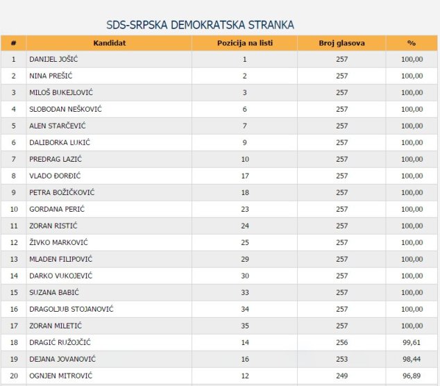 Međutim, to nije sve. Još jedan kuriozitet zabilježen je upravo u Doboju. Na jednom biračkom mjestu, 17 kandidata SDS-a dobili su identičan broj glasova – 257. Među tim kandidatima je i Nina Prešić, predsjednik omladine SDS-a.