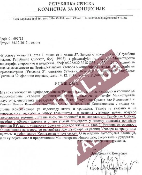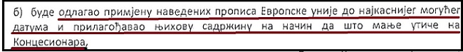 Međutim, Vlada RS je otišla i korak dalje, pa se obavezala da će odugovlačiti i sa sprovođenjem evropskih propisa ukoliko bi oni mogli da imaju štetne posljedice po koncesionara.