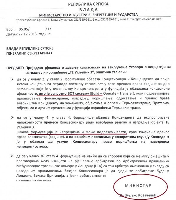 U Prijedlogu rješenja o davanju saglasnosti za zaključenje ugovora o koncesiji za izgradnju TE „Ugljevik 3“ iz 2013. godine navedeno je da je koncesionar insistirao, između ostalog, da se formuliše obaveza koncedenta (RS) da eksproprisane nepokretnosti prenese koncesionaru radi izvođenja radova i izgradnje TE.
