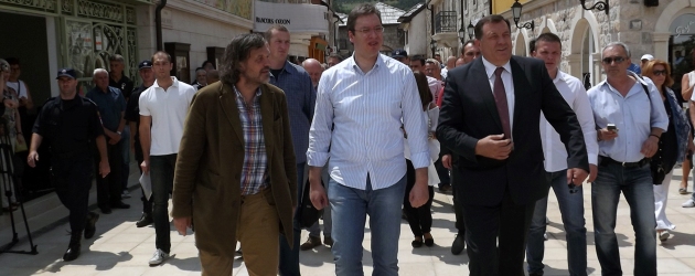 Predsjednik Republike Srpske Milorad Dodik i idejni tvorac Andrićgrada Emir Kusturica na kapiji Andrićgrada danas su dočekali prvog potpredsjednika Vlade Srbije Aleksandra Vučića i zajedno s njim prošetali ulicama grada od kamena.