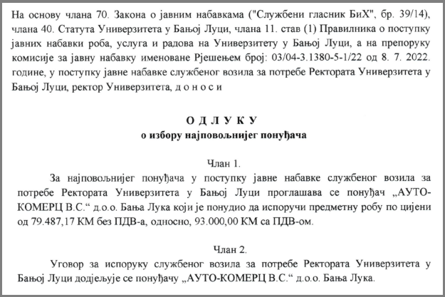 „Za najpovoljnijeg ponuđača u postupku javne nabavke službenog vozila za potrebe Rektorata Univerziteta u Banjaluci proglašava se ponuđač ’Autokomerc V.S.’ koji je ponudio da isporuči automobil po cijeni od 79.487 KM bez PDV-a, odnosno 93.000 KM sa PDV-om“, navedeno je u odluci koju je potpisao rektor Gajanin.