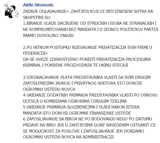 Njihovi zahtjevi se razlikuju od onih koje je pred kantonalne vlasti stavila grupa na čijem je čelu vođa protesta u Tuzli, Aldin Širanović. Prenosimo ih sa Fejsbuk grupe „50 000 ljudi na ulice  za bolje sutra! Pridruzite nam se!