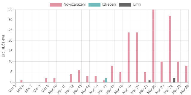 Koronavirus je u našoj zemlji prvi put potvrđen 5. marta u Banjoj Luci, a nakon 20 dana pojavio se u čak 29 naseljenih mjesta (opština i gradova). Do sada su registrovana 173 slučaja, a od toga tri su imala smrtni ishod.